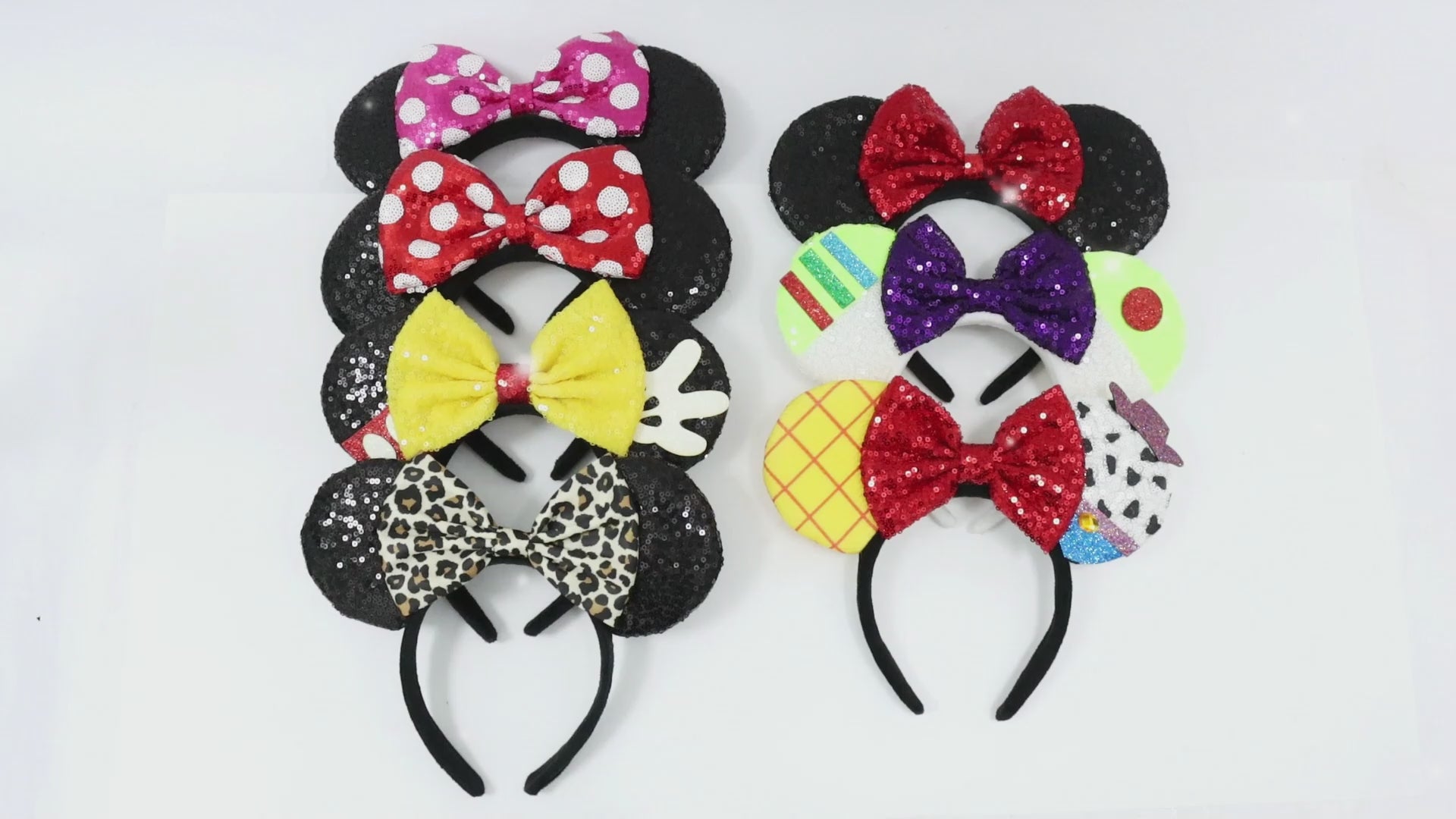Keywords: mouse ears headband, sequin Minnie ears, Disney park accessories, cosplay costume headband, sparkly bow headband, Halloween Disney ears.
